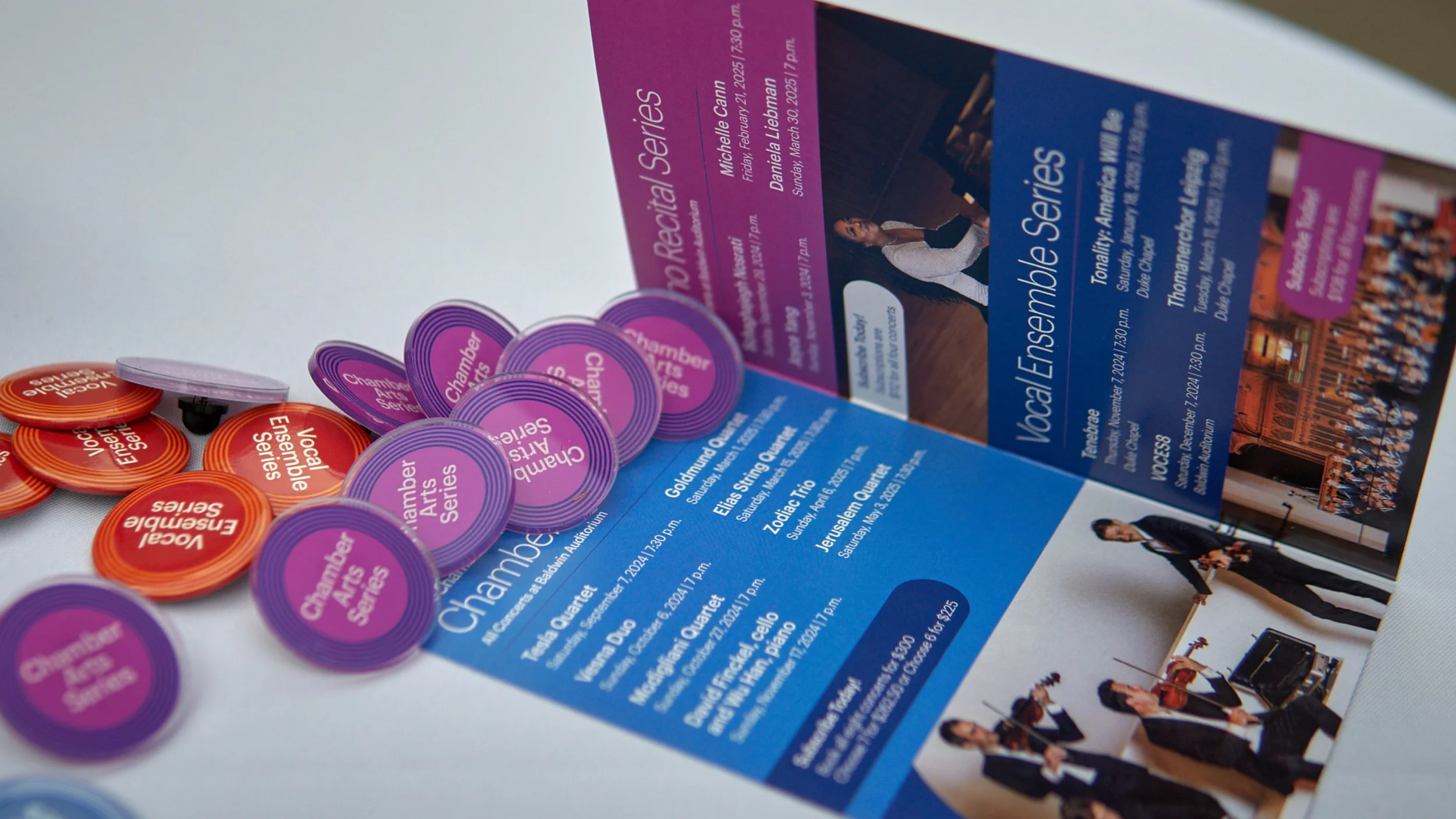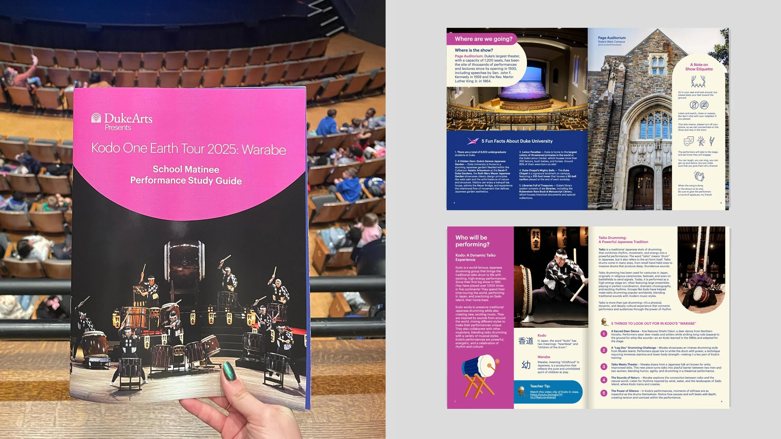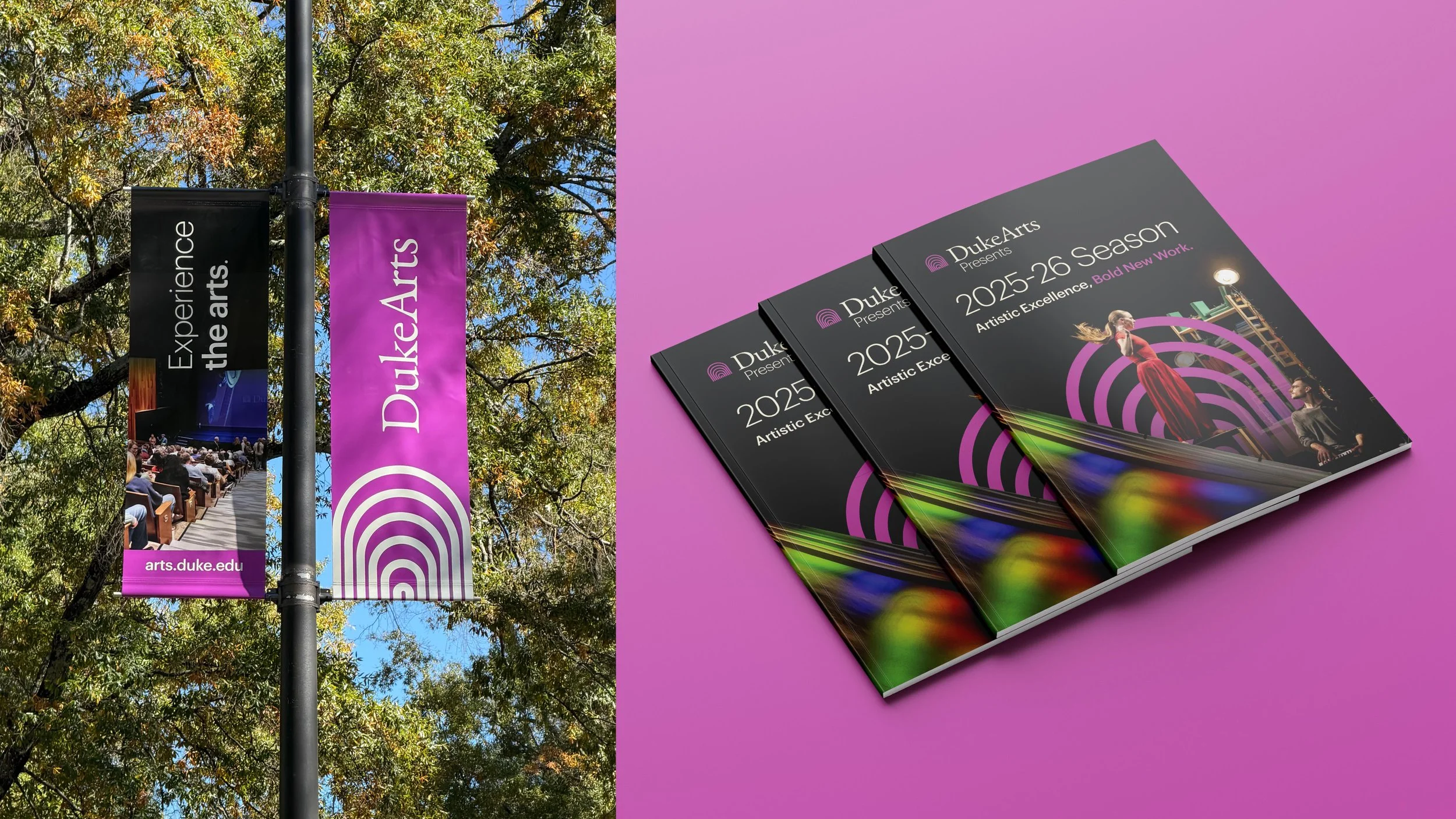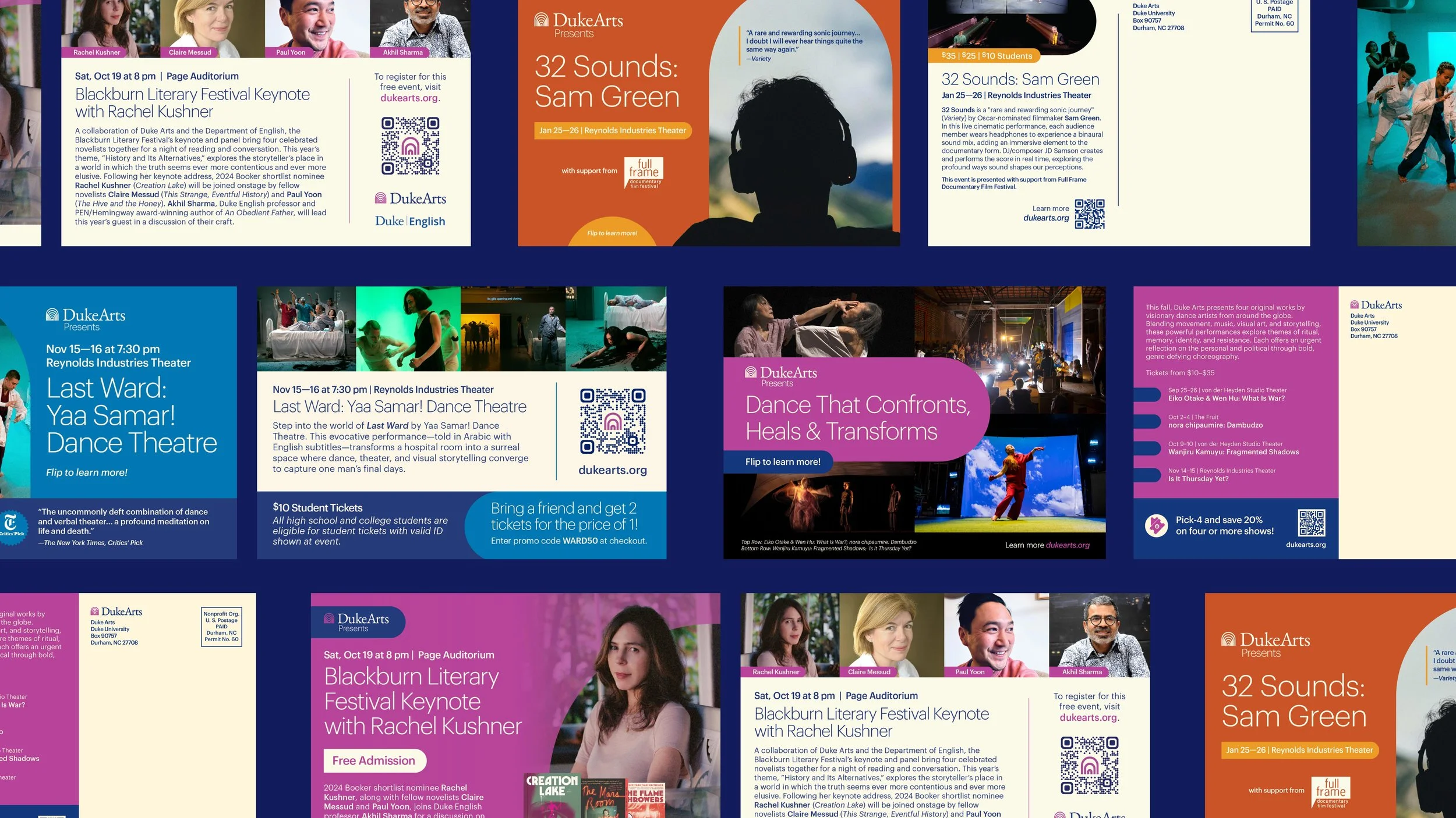 As Head of Design for Duke Arts, I lead the visual direction across print, digital, and environmental platforms. My work includes advertising, signage, and programs for more than 50 performances annually as well as institutional materials such as reports and internal communications. I also oversee branding for major Duke Arts initiatives, including large-scale outdoor concert series and other flagship programs. The projects shown represent a cross-section of this work.