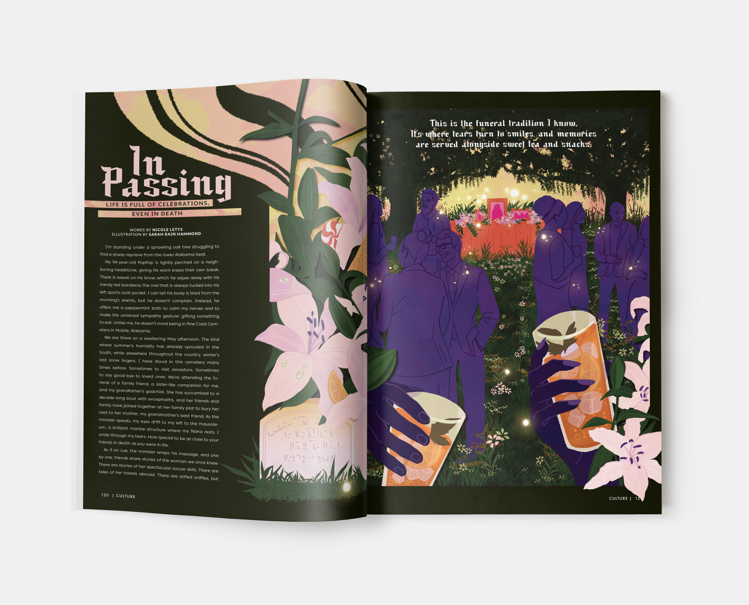 Good Grit Magazine is a lifestyle magazine that focuses on southern culture. They were looking for a full spread and two secondary illustrations to go with a story on southern funerals. The goal was to keep it lighthearted and celebratory, so I focused on making the scenes high contrast with dark, darks. Each illustration was an interpretation of the selected quote.