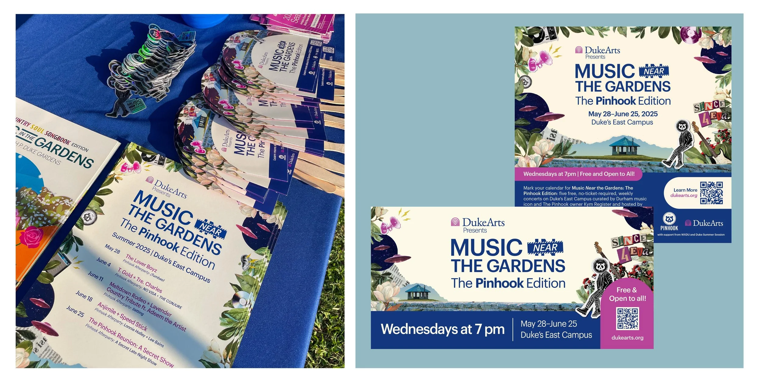 My second project with Duke Arts was branding Music NEAR the Gardens, a reimagined version of their summer music series relocated to Duke’s East Campus. This year’s partnership with The Pinhook, a beloved local music venue and bar, called for a visual identity that honored both the new setting and the venue’s character.